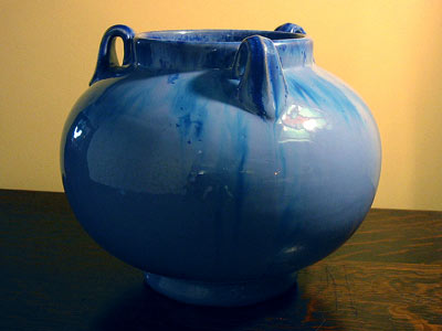 Pottery: Art Pottery Large Chinese Flambe' Glaze Tri-Handled Fulper Pot Signed Fulper pot with excellent tri-handled